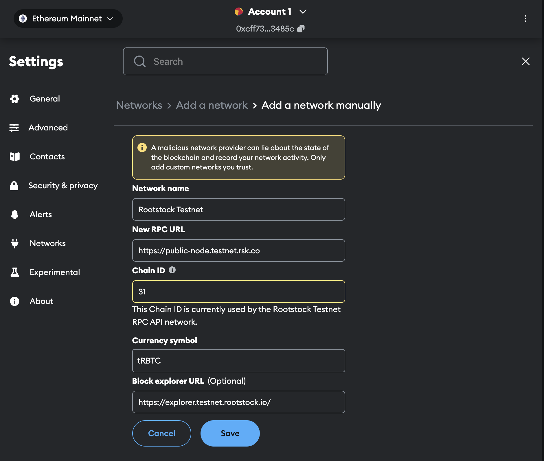 2. Fill the required fields to add Rootstock Mainnet or Testnet with the network settings from the table below: