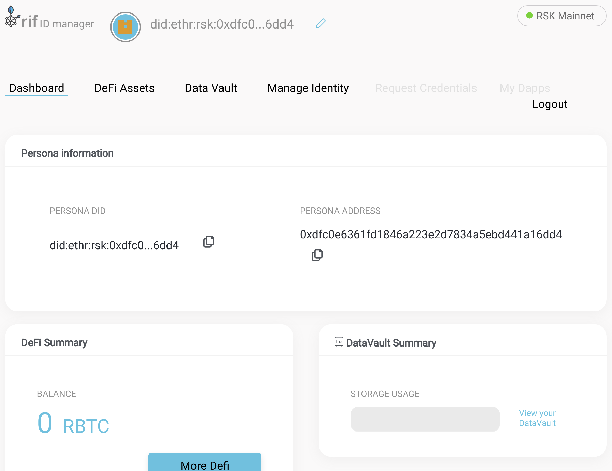 Once you have signed the message and it has been verified, you will see the dashboard for the RIF Identity Manager.