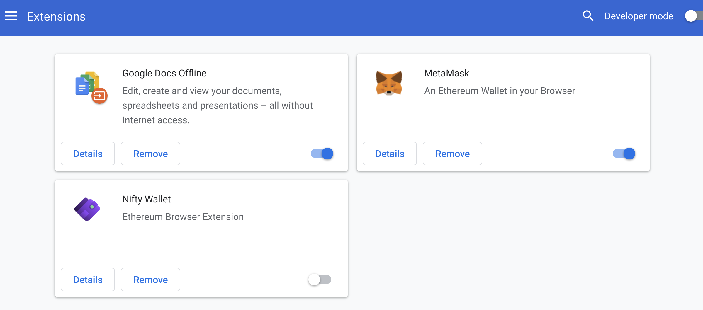 Paste chrome://extensions/ in your address bar, to see all the browser extensions that you have installed. Verify that you only have MetaMask installed, or if you have other Web3 browser extensions, you should disable all of the others by clicking on the toggle buttons.